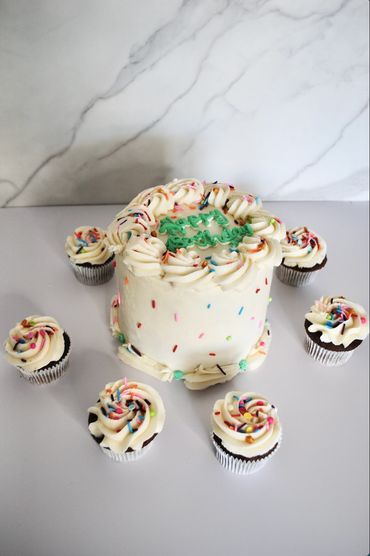 3 - Layer cake filled with classic vanilla buttercream. Decorated with a sprinkle assortment. Customize the cake with a custom message and choose color of the writing. Serves approx. 25 guests.